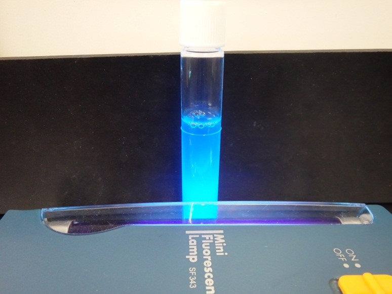 このようにUVランプを当てて蛍光色に光った場合、その水には大腸菌が含まれていることになります。